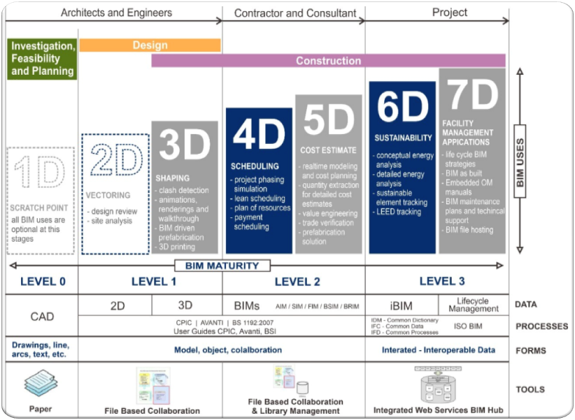 Gambar di atas menunjukkan framework. Mulai dari Investigation dan Feasibility and Planning, Design dan Konstruksi. Dari BIM 1D (dimensi) sampai 7D. BIM 1D artinya masih dalam bentuk titik. Masih dalam tahap “kemungkinan akan dibangun”nya sebuah BIM. BIM 2D sudah meningkat dari angan-angan menjadi desain dan site analisis. Sedangkan BIM 3D sudah menjadi model 3D dan dapat digunakan sebagai alat untuk analisis clash detection dan animasi 3D. Sedangkan BIM 4D jika pada BIM tersebut sudah disematkan informasi mengenai jadwal. Dikatan BIM 5D jika informasi biaya sudah ditambahkan dalam setiap elemen-elemen pembangun BIM. BIM 6D dan BIM 7D adalah BIM dalam tahap operasional. BIM 6D jika memasukkan informasi-informasi berkaitan dengan energi sedangkan 7D berkaitan dengan manajemen fasilitas.